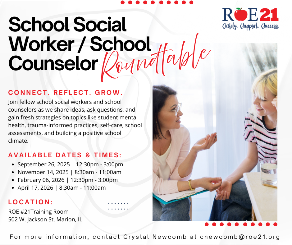 ROE #21 Franklin County Office 901 Public Square, Benton, IL, United StatesPresented by: Crystal Newcomb, MSW Date: January 26, 2026 Time: 9:00am - 11:30am Cancellation Policy: There will be no refunds issued for workshops, trainings, or Administrator Academies unless cancelled by ROE…