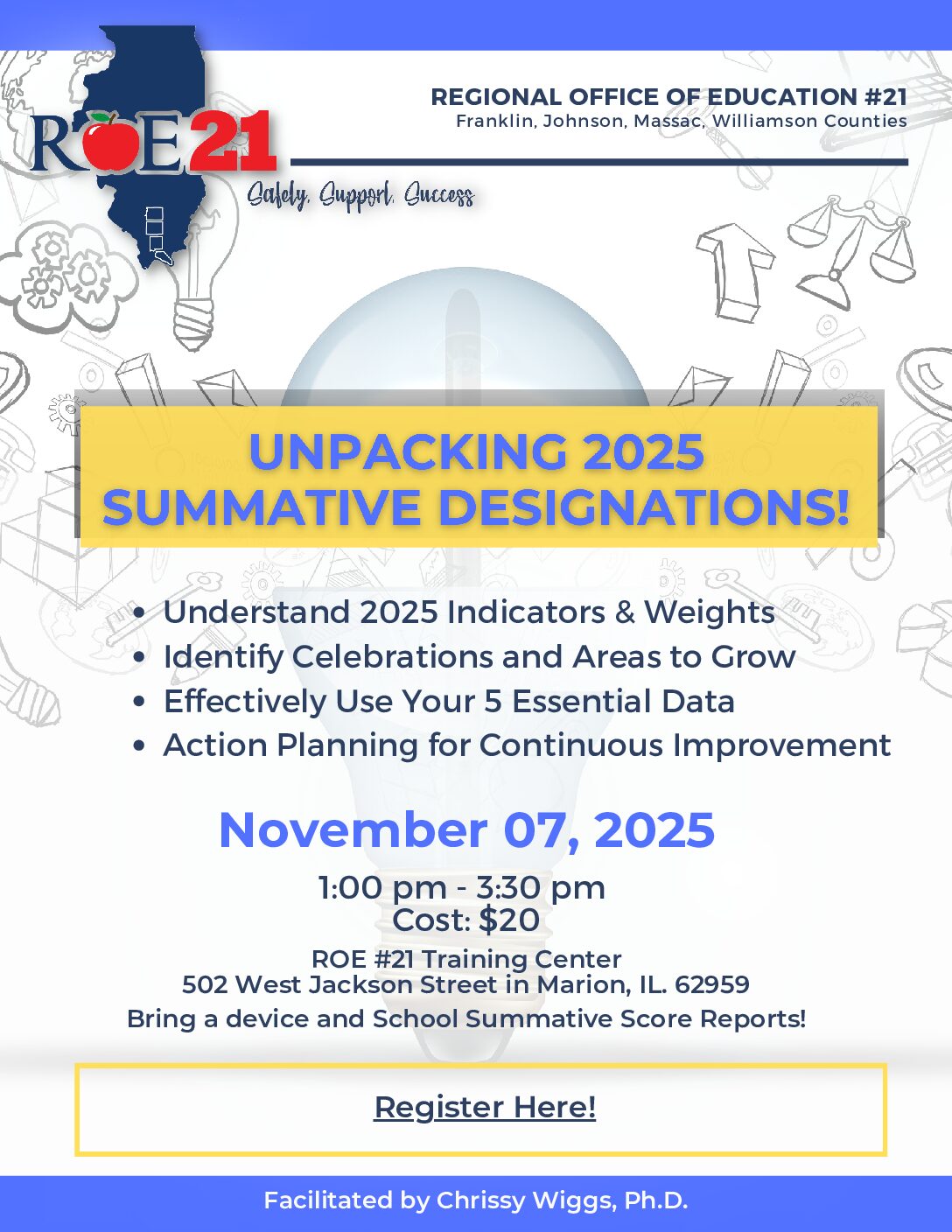 ROE #21 is offering a workshop to help you unpack your Summative Designations! Topics to be covered: Understand 2025 Indicators & Weights Identify Celebrations and Areas to Grow Effectively Use Your 5 Essential Data Action Planning for Continuous Improvement Facilitated by Chrissy Wiggs, Ph.D.