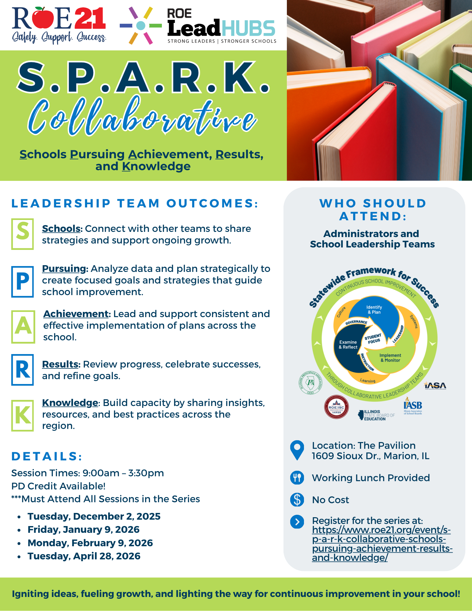 ROE 21, in partnership with the Illinois Elevating Special Educators Network (IESE), is proud to present a dynamic workshop series designed to foster meaningful collaboration, expand professional networks, and strengthen instructional toolkits to more effectively support all students. Participants will: Collaborate around best practices Learn additional strategies to implement Celebrate successes and tackle challenges Receive…